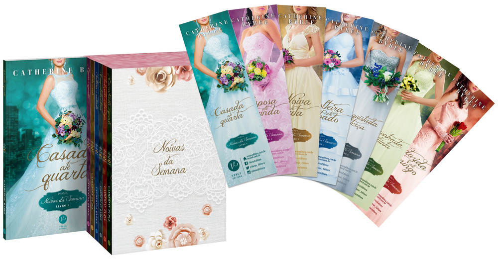 " Os sete deliciosos romances de Catherine Bybee agora juntos em uma linda caixa acompanhada dos marcadores de todos os livros da série! As edições econômica, impressas em papel branco e sem orelha, foram feitas exclusivamente para o box! As histórias de tirar o fôlego de Catherine Bybee que conquistaram milhares de fãs pelo mundo, agora estão reunidas pela primeira vez. Venha se envolver com a paixão, o suspense e a sensualidade da série Noivas da semana, contendo um românce para cada dia da semana! O box inclui os sete livros da série - Casada até quarta, Esposa até segunda, Noiva até sexta, Solteira até sábado, Conquistada até terça, Seduzida até domingo e Encontrada até quinta - e marcadores temáticos. Casada até quarta (196 pág.) Blake Harrison é um homem rico, nobre, charmoso... e precisando de uma esposa até quarta-feira. Para isso, Blake recorre a Samantha Elliot, linda e exuberante, com a voz mais sexy que ele já ouviu. Dona da agência de casamentos Alliance, ela não está no menu de pretendentes... até Blake lhe oferecer milhões de dólares por um contrato de um ano. Agora, ela precisa disfarçar a atração que sente por seu novo marido e evitar a todo custo a cama dele. Mas os beijos ardentes de Blake e seu charme inegável se provam muito difíceis de resistir. Era um contrato de casamento que previa tudo... menos se apaixonar. Agora só resta a Samantha proteger seu coração até que o contrato chegue ao fim. Esposa até segunda (252 pág.) Carter Billings, com seus cabelos loiros, olhos azuis e beleza hollywoodiana, pode ter a mulher que quiser. Mas, quando decide concorrer à vaga de governador do estado da Califórnia, Carter sabe que vai precisar abandonar a vida de solteiro. E para isso ele precisa de uma esposa. Entra Eliza Havens, que gerencia a agência de casamentos Alliance. Eliza nunca brigou tanto com um homem - e nunca conheceu alguém que mexesse tanto com ela. Juntar pessoas solitárias é a maneira como ela ganha a vida, porém um obscuro segredo do passado a faz descartar totalmente a possibilidade de se casar. Pelo menos foi assim até agora... Noiva até sexta (308 pág.) Gwen Harrison é a bela filha de um duque inglês que se mudou para os Estados Unidos para cuidar da agência de casamentos de sua cunhada. Só porque ela agora é a chefe da agência, não significa que não possa fantasiar um encontro perfeito com o enigmático Neil MacBain, o guarda-costas que vem tornando seus sonhos um tanto quanto agitados. O ex-fuzileiro naval Neil MacBain não pode negar o efeito da aristocrata Gwen em seu corpo esculpido pela rotina militar. Mas negócios são negócios, e manter distância é fundamental - até uma ameaça do passado de Neil retornar e Gwen se ver no meio do fogo cruzado. Agora depende de Neil decidir o que é mais importante salvar: sua carreira, sua vida... ou a mulher que conquistou seu coração. Solteira até sábado (280 pág.) Karen Jones se casou com um astro de Hollywood, porém é ela quem desempenha diariamente um papel - o de esposa feliz. Um ano atrás, ela concordou em se casar um ator famoso para dissipar rumores sobre a vida pessoal dele. Agora seu divórcio se aproxima, assim como um pagamento de cinco milhões de dólares. No entanto, conforme Karen se prepara para abandonar com elegância seu casamento arranjado, ela conhece o cunhado, Zach Garnder, um homem lindo de morrer. E quando o casal famoso decide visitar a família Gardner, Karen precisa esconder o segredo do marido e de seus parentes bisbilhoteiros... incluindo Zach, o homem que talvez seja o verdadeiro amor da vida dela. Conquistada até terça (290 pág.) Judy Gardner acabou de se formar na faculdade e está pronta para ganhar o mundo... desde que consiga um emprego. Enquando não se torna a profissional respeitada que espera ser, ela se muda para a casa de seu irmão celebridade em Los Angeles. Mas é difícil para Judy se concentrar no trabalho quando o guarda-costas sexy por quem ela se apaixonou no verão passado continua aparecendo em sua vida e tirando seu fôlego. Com um corpo musculoso, olhos verdes e sorriso fácil, Rick Evans poderia ter a mulher que ele quisesse. Mas ele só tem olhos para a impulsiva Judy. Quando ela sofre um ataque, Rick sabe que não vai parar até ter certeza de que a mulher da sua vida está a salvo do monstro atrás dela. Seduzida até domingo (294 pág.) Meg Rosenthal, administradora de agência de casamentos e realista nas horas vagas, não é mulher de se deixar seduzir por um empresário bonitão em um terno feito sob medida. Mas há algo no fascinante italiano Valentino Masini que é difícil de resistir, mesmo para uma mulher que se recusa a se apaixonar. O lindo e bem-sucedido homem de negócios está acostumado a ter as melhores coisas da vida. No entanto, ele nunca quis nada como quer Meg, a mulher que está criando uma tormenta em seu coração. Quando ele finalmente decide convencê-la a ficar, uma pessoa misteriosa resolve que talvez seja a hora de tirar Meg da ilha... para sempre. Encontrada até quinta (336 pág.) Gabriella Masini vive assombrada pelo passado, com as cicatrizes que não a deixam esquecer. Trabalhando na Alliance, a agência de casamentos de elite, ela é ótima com números, mas não consegue somar dois mais dois quando se trata de seu último cliente: um bilionário bad boy com seus próprios segredos. Hunter Blackwell tem uma razão secreta para querer se casar, pelo menos por um tempo - e acha que a sensual e atrevida Gabi é perfeita para o papel. Quando Gabi se recusa a ser sua esposa temporária, Hunter faz uma oferta que ela não pode recusar. Mas o casamento de conveniência se torna perigoso, e Hunter deve decidir até onde iria para cumprir a promessa de honrar e proteger Gabi para sempre." Catherine Bybee foi criada no estado de Washington, nos Estados Unidos. Depois de se formar no ensino médio, mudou para o sul da Califórnia na esperança de se tornar at