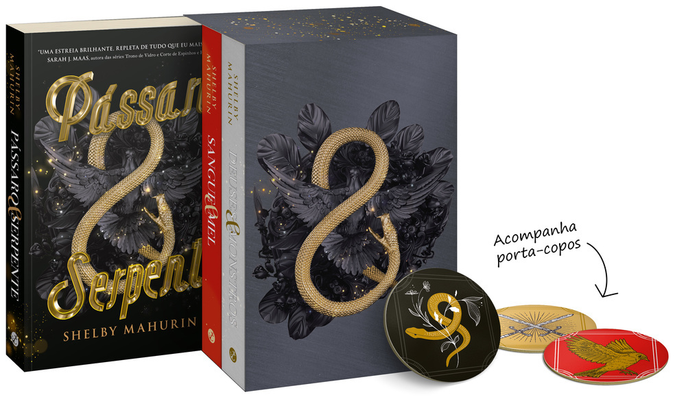 Neste box especial, confira todos os livros da trilogia Pássaro e Serpente, da autora best-seller do New York Times Shelby Mahurin. Perfeita para fãs de Sarah J. Maas, conheça Louise Le Blanc e Reid Diggory, que, unidos por um amor proibido, embarcarão numa jornada eletrizante em meio a perseguições, perigos e sede de vingança. Em Pássaro e serpente, um encontro improvável entre uma bruxa e um caçador de bruxas dá início a um desejo inesperado que une bruxaria, perigos e um amor proibido.Em Sangue e mel, o segundo volume da trilogia, as apostas estão mais altas. E as bruxas, com sede de vingança. Após os incidentes no final explosivo do primeiro volume, Lou e Reid precisarão recorrer a aliados improváveis para sobreviver.Em Deuses e monstros, a conclusão arrebatadora da trilogia, Lou e seus aliados enfrentarão, literalmente, deuses e monstros para que todos com quem se importam possam se manter a salvo. Em meio a dificuldades e um desfecho sombrio iminente, Lou e Reid precisarão enfrentar seus demônios e, finalmente, parar de fugir. Shelby Mahurin cresceu em uma pequena fazenda na zona rural de Indiana, onde gravetos se transformavam em varinhas e vacas, em dragões. Sua imaginação desmedida não foi embora com o tempo, então ela continua a brincar de faz de contas todos os dias – mas, agora, com palavras, ao invés de vacas. Shelby assiste à série The Office e é uma leitora voraz. Ela ainda vive próximo à fazenda onde passou sua infância, com seu marido e seus filhos. Você pode visitá-la em shelbymahurin ponto com.