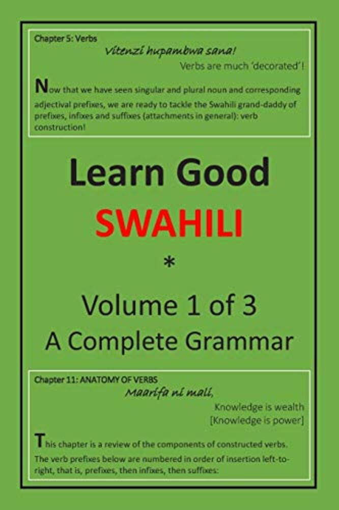 Learn Good Swahili is presented in 3 volumes: Volume 1: A Complete Grammar. 349 pages. Volume 2: 5,000+ words Swahili-English Dictionary. 370 pages. Includes a built-in mini-thesaurus. *,**see examples below. Volume 3: 5,000+ words English-Swahili Dictionary. 427 pages. Includes a built-in mini-thesaurus. *,**see examples below. Volume 1 contains step-by-step explanations of all features of Swahili grammar, with lots of examples and exercises, plus indexes. For anyone new to Swahili or wants to improve or brush up - whether you are a tourist, an expatriate, a volunteer, etc in East Africa - these are the books you need to enhance your experience there, for being able to communicate with locals in their language is always most satisfying. All proceeds of this book will go to needy school children in Tanga, Tanzania where the author was born, grew up and finished high school. *An example of a dictionary entry: lingana nbsp;v nbsp;nbsp;nbsp;match e.g. kusoma kwa mtoto kunalingana umri wake, the child's reading matches her age where "v" indicates verb. Note: All Swahili text in all volumes is italicized as seen above, to visually distinguish it from all the other English text. **The built-in mini-thesaurus takes two forms: (1) Related Words e.g. the entry for "abadan" has Related Words, as follows: ["F" = foreign-origin; "adv" = adverb] abadan nbsp;F nbsp;adv nbsp;nbsp;always e.g. yeye abadan haridhi, he is never contented Related Words: baadaye, later/then daima, always halafu, then huenda, sometimes kabla ya, before kamwe, never kila mara, every time, always kisha, afterwards milele, forever punde, shortly sasa, now zamani, earlier (2) Words grouped under the following categories: body, building structure, fauna, food, person, produce, terrain, tool, utensil, vegetation (including flora) and for adjectives, colours e.g. some of the entries under body are, in alphabetical order in English: [entries in brackets such as "(m,mi)" = (singular, plural prefixes); "n" = noun; "V", "xFF", "xFV", "U", "T" are noun groups as explained in Volume 1, Chapter 3: Nouns] mkono(m,mi) n body: arm V kwapa(-,ma) n body: armpit xFF mgongo(m,mi) n body: back V ndevu(-) n body: beard xFV mshipa(m,mi) n body: blood vessel V ... mkia(m,mi) n body: tail V paja(-,ma) n body: thigh xFF koo(-,ma) n body: throat xFF ulimi(ul,nd) n body: tongue U mkonga(m,mi) n body: trunk (elephant) V kiuno(ki,vi) n body: waist T (A total of over 70 entries under body)