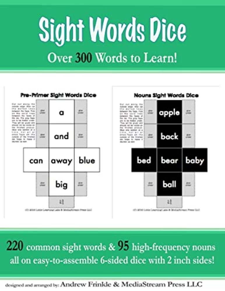 Sight Words Dice are easy-to-use oversized dice designed to help beginning language learners recognize their sight words. They are broken into the common 5 stages: pre-primer, primer, first, second, and third sets. Also included are the 95 common nouns dice (in black to set them off). Use them in games, in lessons, and other activities at home or in the classroom.With scissors, tape or glue, and a little patience, you will have over 300 starting English words on dice! These make great ESL and EFL tools, too!