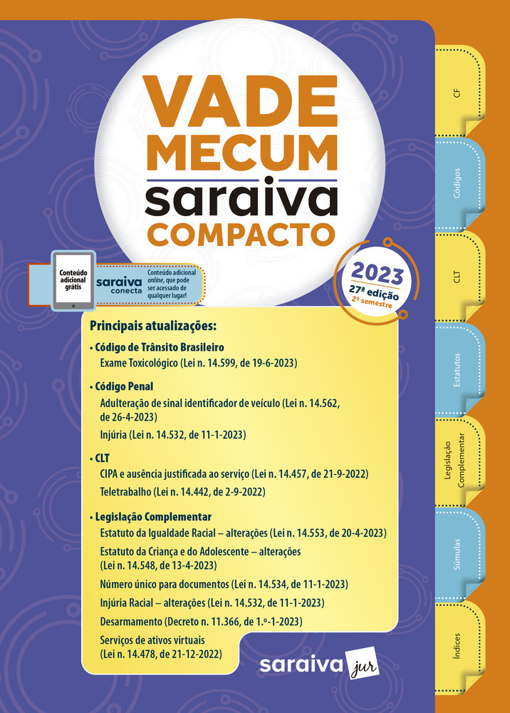 Data de fechamento da obra: 6-7-2023Com conteúdo criteriosamente selecionado para consulta básica no dia a dia, o Vade Mecum Compacto, chega à sua 27ª edição. A obra reúne as normas mais utilizadas por profissionais e acadêmicos da área jurídica.Sua estrutura foi pensada de forma a proporcionar o maior número de diplomas legislativos sem comprometer a legibilidade e o trabalho editorial.A edição traz ainda notas de correlação entre as matérias, já tão tradicionais nas obras de legislação Saraiva, assim como índices multifuncionais, que permitem rápida localização de qualquer assunto por ordem alfabética, cronológica, pelo número do diploma ou por seu tema. Além de tudo isso, a partir desta edição, uma NOVIDADE: Saraiva Conecta – acesso exclusivo e gratuito à plataforma de conteúdos complementares ao livro, na qual você terá disponível:– Legislação adicional – diplomas que completam o extenso conteúdo impresso da obra, para você consultar em qualquer lugar;– Serviço Atualize seu Código – atualização semanal de todo o conteúdo impresso.Principais Atualizações da 27.ª edição: - Constituição Federal (até EC n. 129, de 5-7-2023)- CLTIgualdade salarial (Lei n. 14.611, de 3-7-2023)- Código de Trânsito BrasileiroExame toxicológico (Lei n. 14.599, de 19-6-2023)- Código Penal Adulteração de sinal identificador de veículo (Lei n. 14.562, de 26-4-2023)Injúria (Lei n. 14.532, de 11-1-2023)- Legislação ComplementarEstatuto da OAB – alterações (Lei n. 14.612, de 3-7-2023) Igualdade salarial entre mulheres e homens (Lei n. 14.611, de 3-7-2023)Estatuto da Igualdade Racial – alterações (Lei n. 14.553, de 20-4-2023)Estatuto da Criança e do Adolescente – alterações (Lei n. 14.548, de 13-4-2023)Número único para documentos (Lei n. 14.534, de 11-1-2023)Injúria Racial – alterações (Lei n. 14.532, de 11-1-2023)Desarmamento (Decreto n. 11.366, de 1.º-1-2023) Serviços de ativos virtuais (Lei n. 14.478, de 21-12-2022)